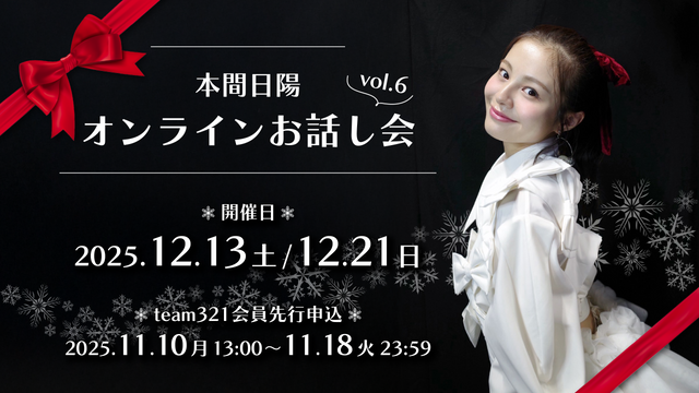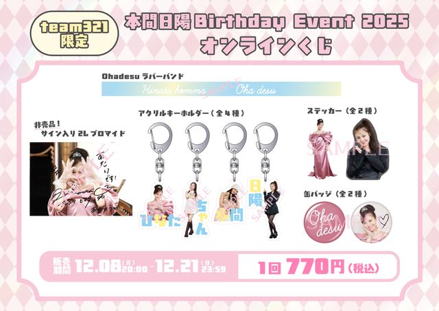 2025年11月9日(日)に開催された「本間日陽 Birthday Event2025」にて販売されたくじを本間日陽 オフィシャルメンバーシップ「team321」会員様限定での販売が決定いたしました!